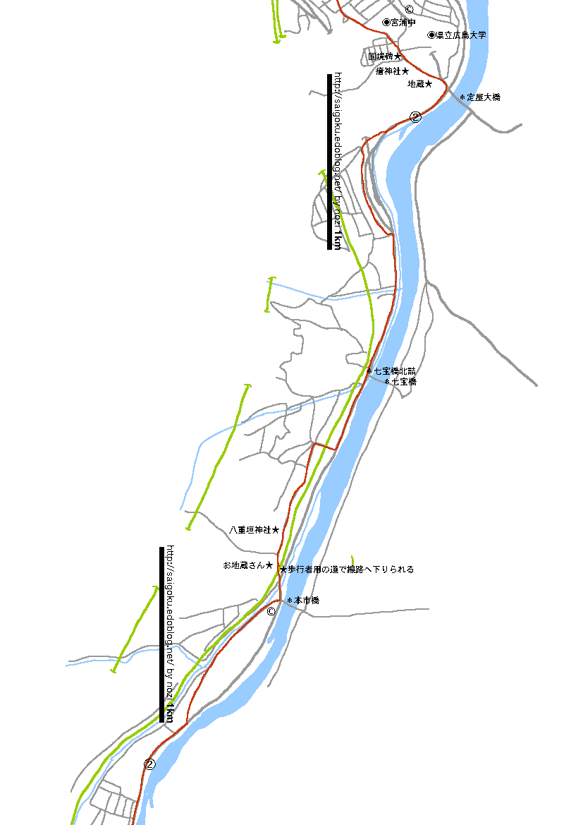 本郷駅を過ぎてから2号線へ合流、そこから三原までは、特に面白いこともなく黙々と歩くのみです。身もふたもなくすっとばしてもいいのですが、一カ所、本市橋を過ぎたところで線路を渡る場所が、歩行者用の通路みたいな極細道なので見落としそうです。あと、途中にある八重垣神社、旧道が参道を横切る形でついているので何だか妙な感じがします。