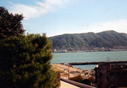 関門海峡はまるで川みたいですが、磯のかおりが。コンテナを満載したタンカーがいったりきたり