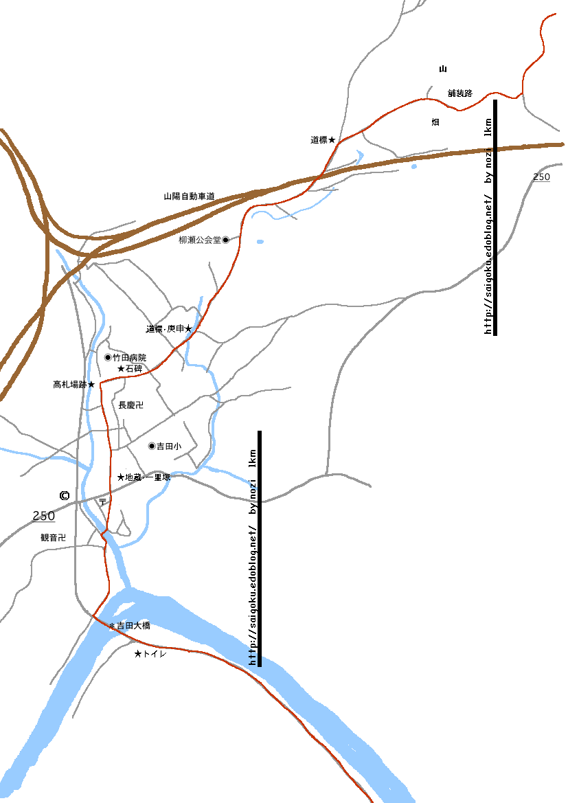 吉田大橋のたもとで、33号線と分かれて、古い家のならぶ細い通りへ入ります。いや、長かった。並走する33号線にコンビニがあります。此処から当分コンビニなんてありません。
