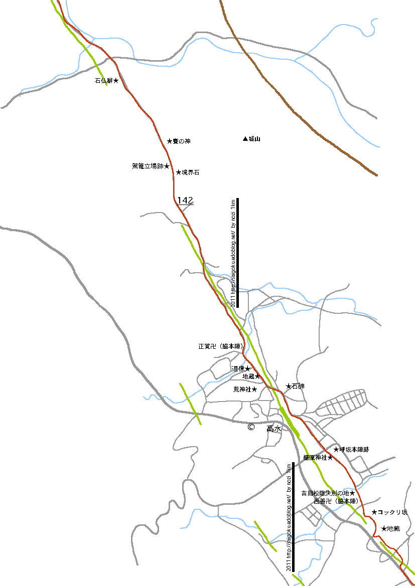 コックリ坂をすぎたらすぐに呼坂宿に入ります。直ぐに本陣跡があるので、そこが呼坂の中心として、その先古い家がちらほら見られる小さな集落が続いて、何時とぎれるともなく高水駅、今市へ入ります。何処から何処までが呼坂なのか今ひとつ分かりませんでした。突き当たりにある正覚寺が今市の脇本陣らしいのですが、二宿はとても近いです。地図上で一ページに収まってしまうので、二つまとめました。