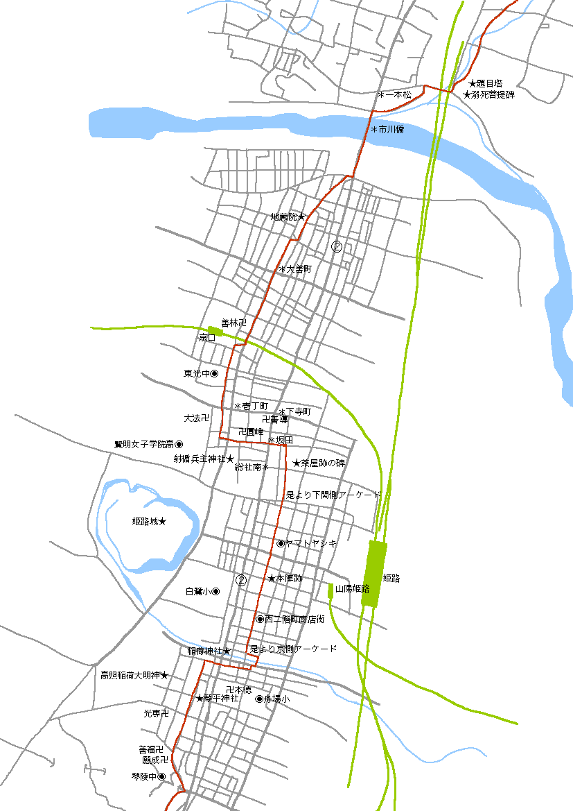 町中ゆえ特に何も残っていません。姫路城は城への興味があまりないのでスルーしましたが、博労町、綿町、元塩町、その他にも紺屋町やら呉服町やら、地名に昔の城下の名残があって面白いです。淡々と家々の間を歩いて市川橋で川を越えました。