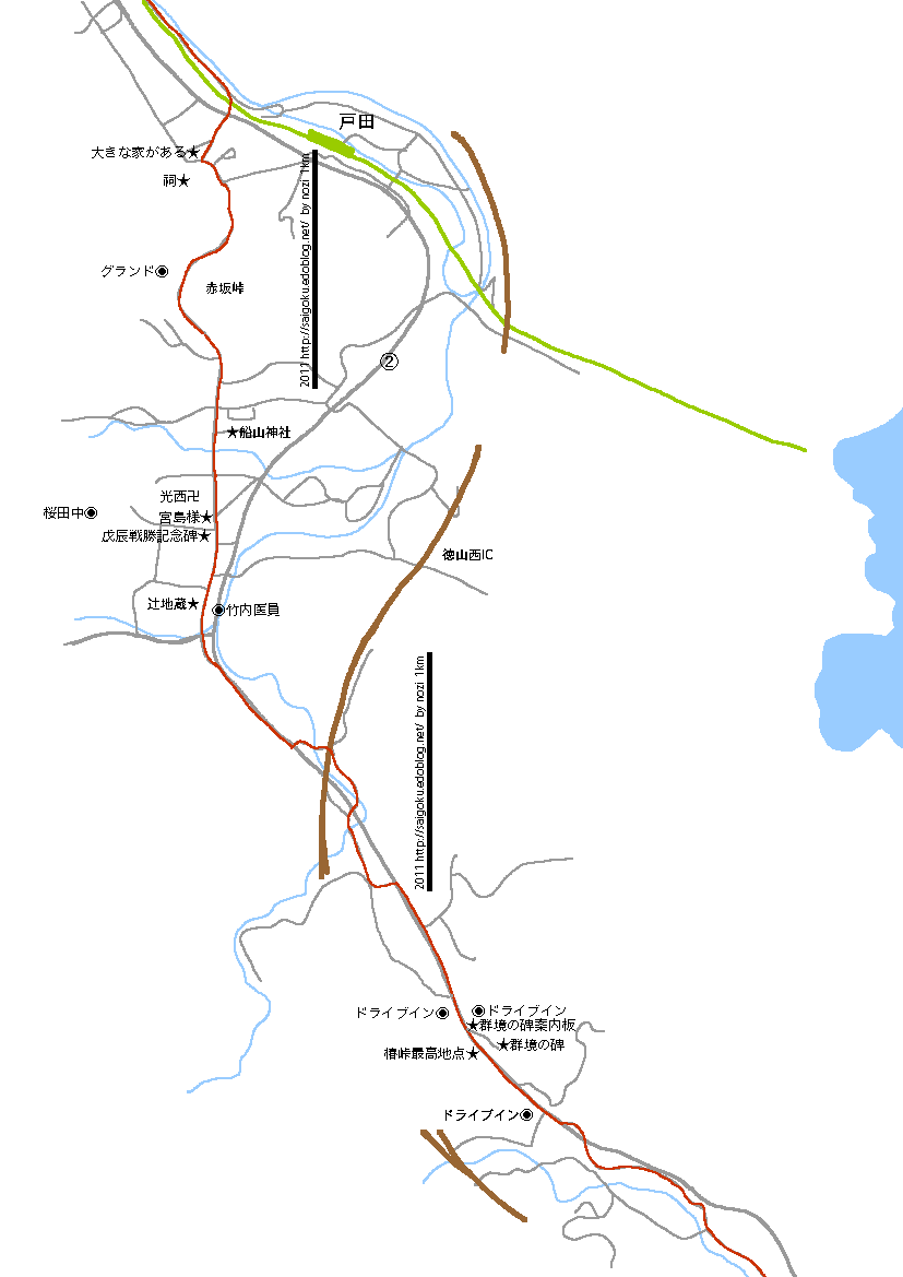 そのすぐあとのドライブインで、左に入る道があります。資料によってはこっちが旧道なので、わざわざ国道あるかなくてもこっちを行けば良いと思います。赤線ひきなおそうかと思いましたがめんどくさいのでそのまま載せましたが。