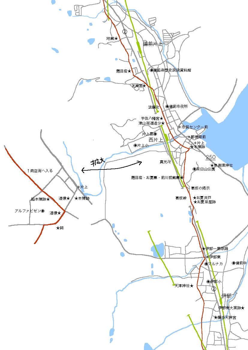 峠を越えると片上宿に入りました。拡大図の通り、アルファビゼンをぐるっと回り込む感じで直ぐに商店街へと入ります。本陣が街道から少し外れた所にあるのと、道の走行が複雑で方向を見失いやすいのとで、少し迷いました。この辺り、地元の方が一つ一つの史跡に説明を添えてくれているので、右見たり左見たり忙しいです。とても地図には載せきれていませんが、行けば見落とす事は無いので一杯あるしとても親切!ってことだけ書いておきます。