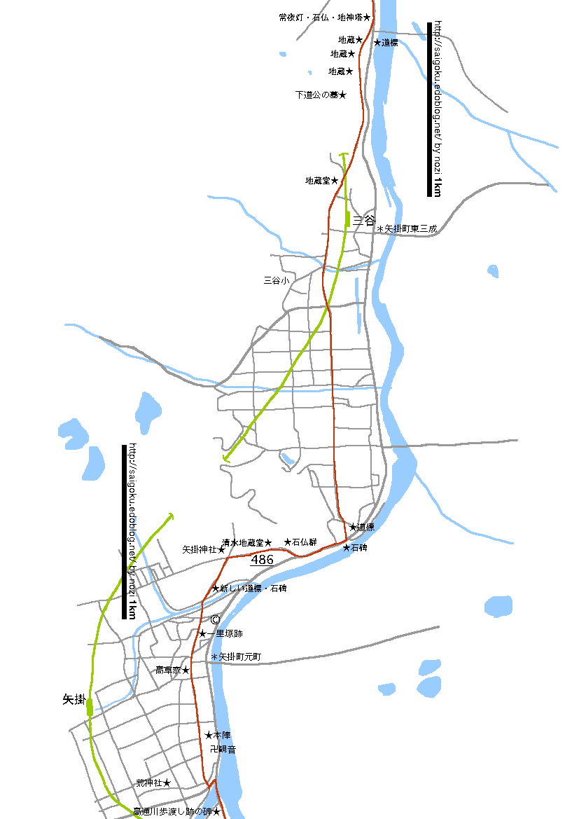矢掛宿をでてしばし川を下ります。川沿いの道標は、右玉しま、左大阪道とあります。玉島は是より南にある岡山県内の地域ですが、それに比べて左の目的地は遠大ですね。