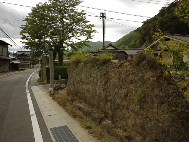 いかにもな雰囲気の静かな集落を進むと、左側にちょっと目立つ木が一本生えていて、石碑かお地蔵さんかなんか、あるのかなあと思って近づいたらそこが本陣跡でした。いまにも崩れそうな(というかほとんどくずれて草が生えている。)土壁が唐突にあり、ずっと昔の廃屋かとおもったら、ずっとずっと昔の廃屋だったという、街道を愛する人々にとってはなんかハラハラする仕様です。これ、保存とか…