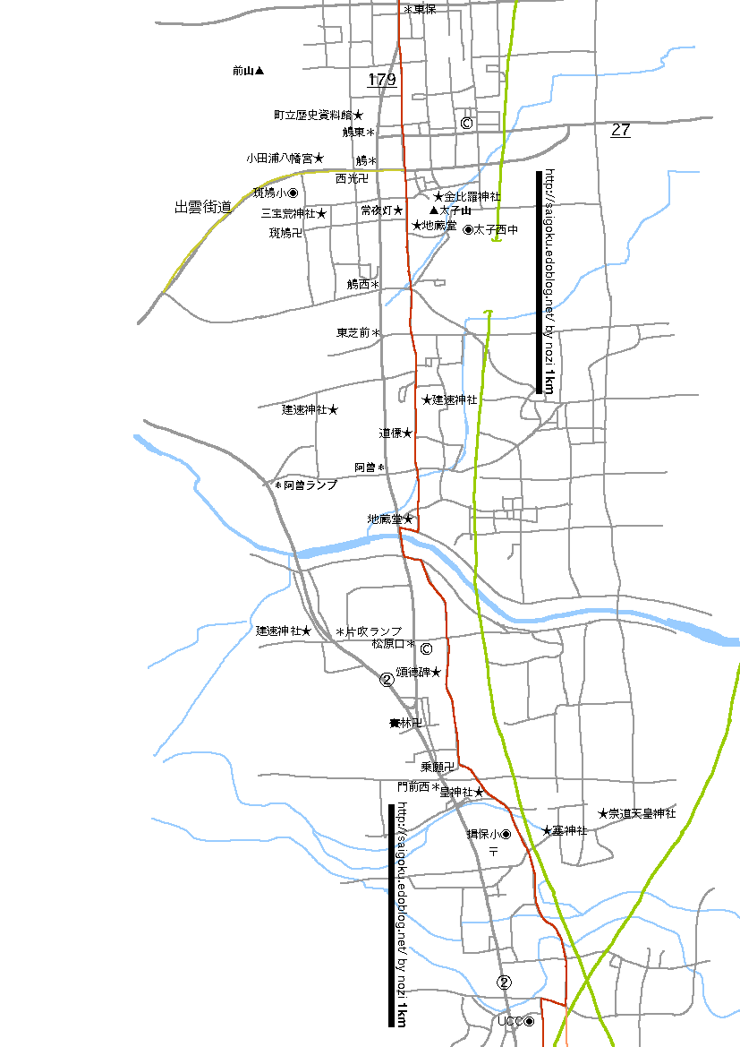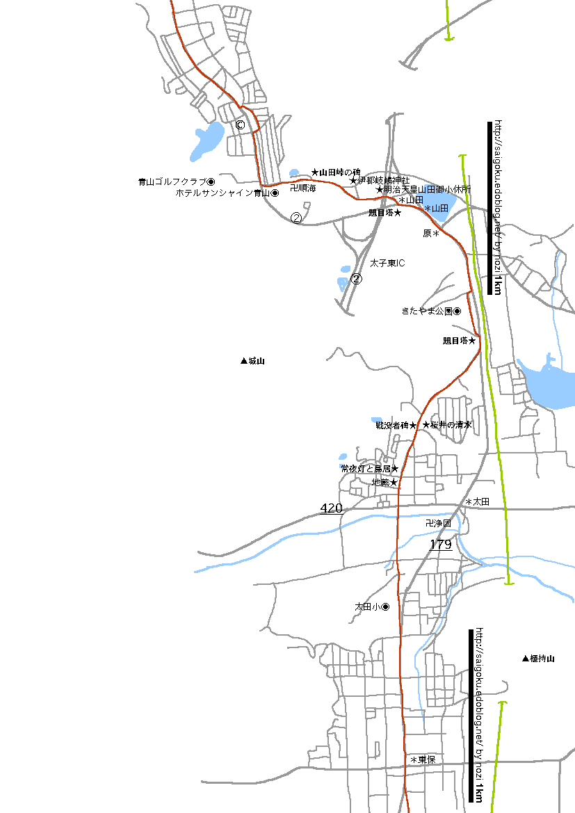 左手に巨大な常夜灯と火の見櫓を見て、道はわずかの間上って下りて、もう一度179号線と合流しました。