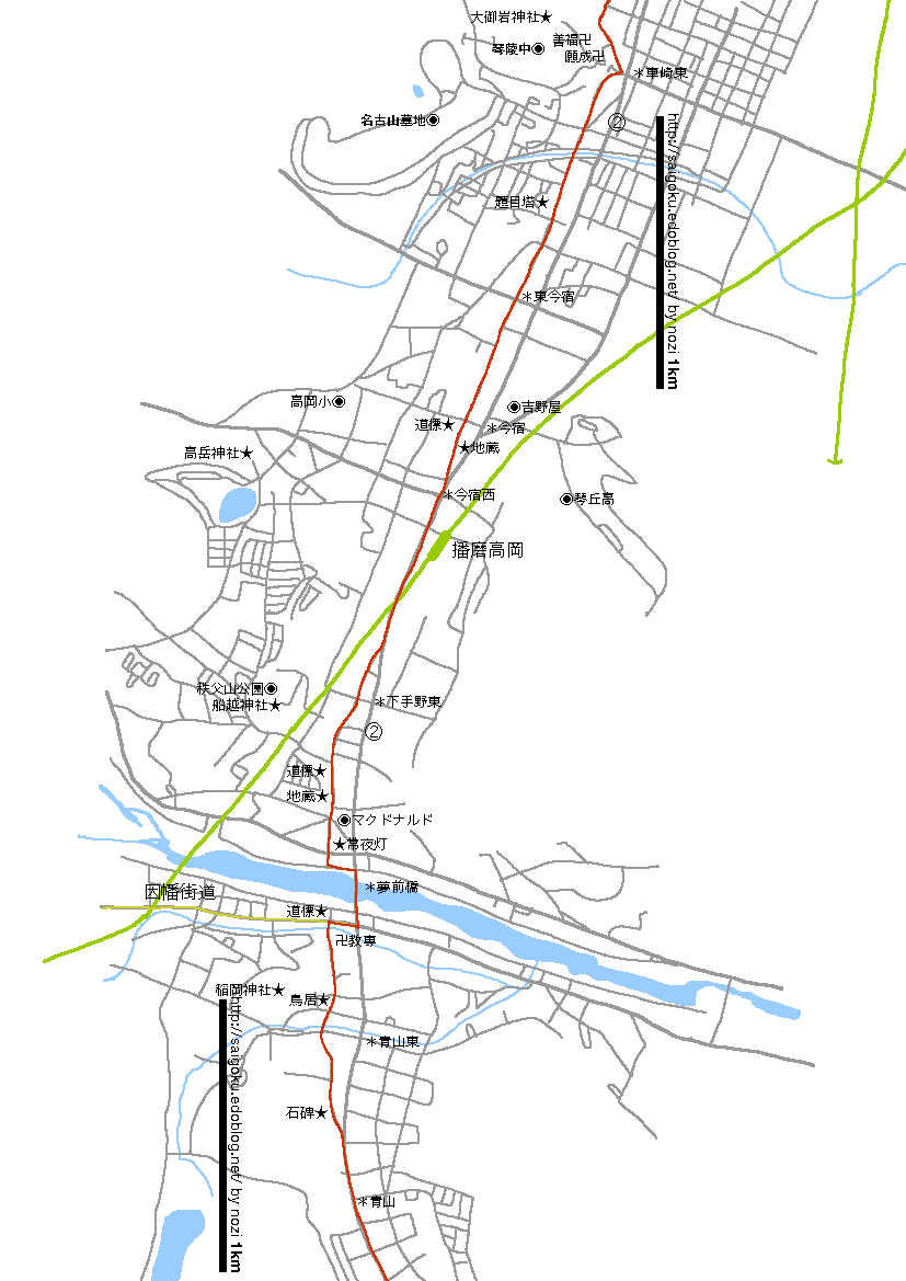青山交差点の先で旧道へ入ると、稲岡神社の立派な鳥居が見えてきます。兵庫人の鳥居へかける情熱は凄いと思います。大きいのも大きいですが額束(鳥居の真ん中の神社の名前が書いてあるとこ)の凝り様…龍がうねってたりね。そういえば、広島東から岡山では、鳥居よりさらに前の門柱(?)が立派で、武運長久とかそんな感じの言葉が彫ってありました。