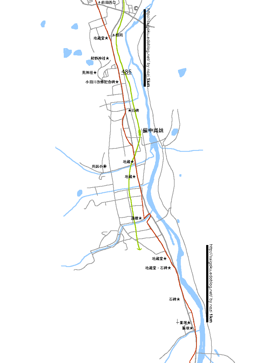 道は川からはなれ、田圃の中を真っ直ぐ進みます。ひたすら静かな道で、三谷駅手前で線路をくぐる時丁度井原鉄道の電車がかたんかたんと通り過ぎた音だけが妙に印象に残っています。一両編成の電車が芋虫のようで可愛い。