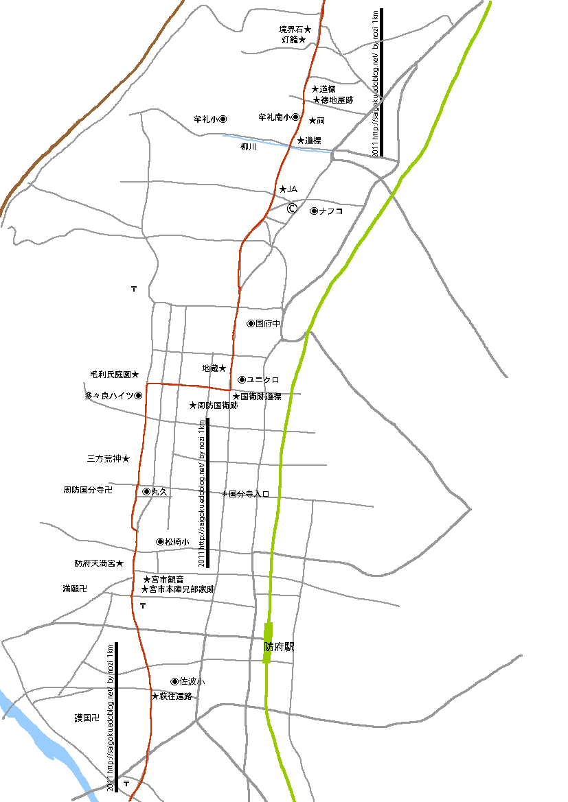 防府の町中は、特に観光とかしてないし、時々古い家があるくらいで普通に町中の道です。直角に南へまがるところが分かりづらい。毛利氏庭園入り口のもう一つ先です。国衛跡があってユニクロに突き当たれば正解。私は一個手前で曲がってしまいました。